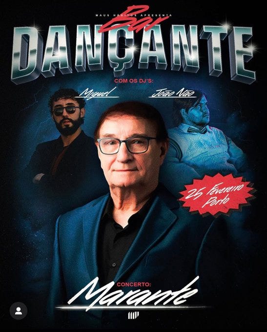 Outra: o Marante é agora um mito entre os jovens, uma estrela no circuito independente de Lisboa e Porto, tanto que esgotou uma noite no Maus Hábitos e encheu as Virtudes. Tudo montado pelo Mike El Nite e pelo João Não, com a marca Bar Dançante, que promete levar os nomes da música ligeira portuguesa (ou, em português, da música pimba) a sítios onde, normalmente, eles não passariam. É esperar mais meia dúzia de meses para ver a Romana no Plano B ou o Nel Monteiro no Musicbox. Ou o Saul a abrir para os Broa de Mel no Milhões de Festa. O fenómeno mais recente é o Pedro Mafama, uma personagem adorável mas com música terrível, que lançou um álbum que tem como objetivo trazer de volta a música de baile, mas ele, o Mafama, é peremptório em dizer que quer inovar no estilo a cada álbum e que se for preciso mudar de estilo vai fazê-lo.
